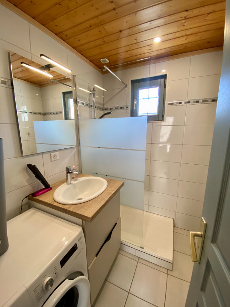 Salon confortable et salle d’eau.
